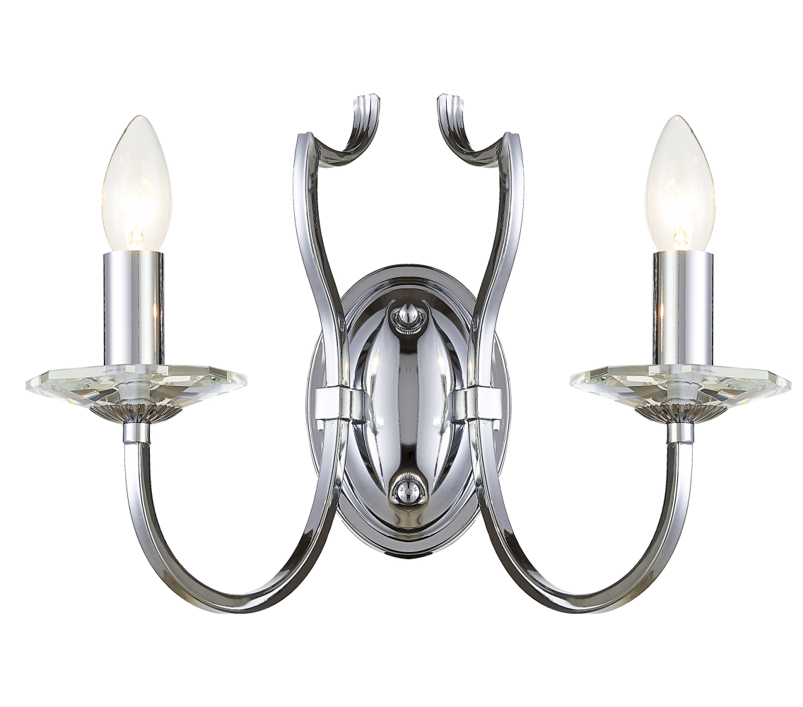 Podwójny kinkiet Riga pokryty został chromem, a jego \”świeczniki\” zdobi kryształowe szkło. Niebanalna propozycja dla miłośników stylu klasycznego.