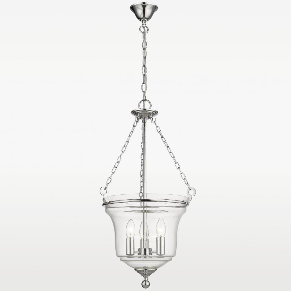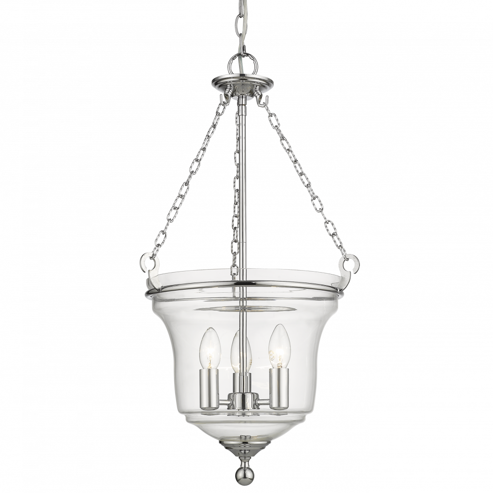 Prague P03950CH jest lampą o niezwykle ciekawym kształcie. Szklany klosz otwarty z góry, w którym są skryte trzy świeczniki na dole zakończony jest ozdobnym elementem. Całość wisi na trzech łańcuchach, przez co oprócz przyciągającego wzrok designu gwarantuje również trwałość konstrukcji i stylu.