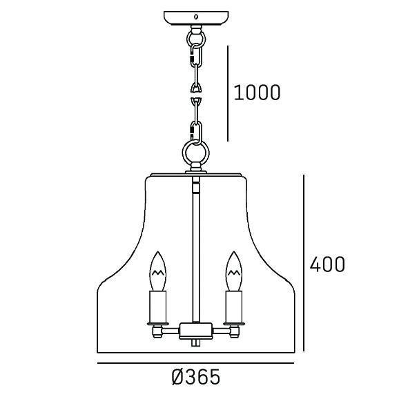 Wnętrze lampy i źródła światła usytuowane na świecznikach są zawieszone na cienkiej rurce. Dół lampy nie jest zakryty co ma też swoją dodatkową użyteczność - nie zbierają się tam drobinki kurzu oraz owady. Całość jest zawieszona na łańcuchu, który można dowolnie skrócić poprzez usunięcie odpowiedniej liczby ogniw.