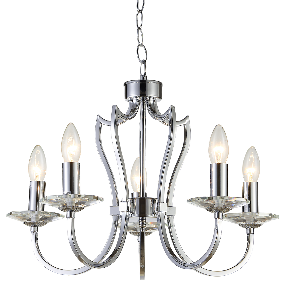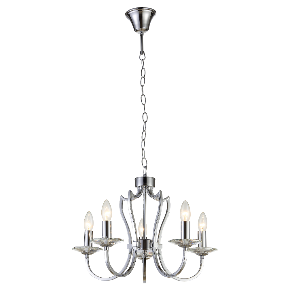 Elegancka lampa wisząca została pokryta chromem, a świeczniki dekoruje grube kryształowe szkło. To wyjątkowa propozycja dla poszukujących produktów klasycznie pięknych, bez zbędnych ornamentów.